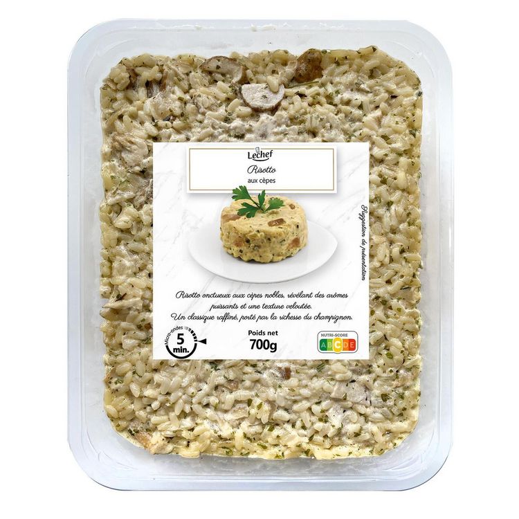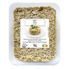Ingrédients : Riz cuit 32%, cèpe 28%, CREME 23%, oignon, BEURRE 4,4%, ail 1,1%, persil 0,9%, arôme naturel, sel, farine de tapioca, thym 0,07%, poivre.