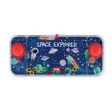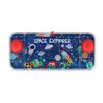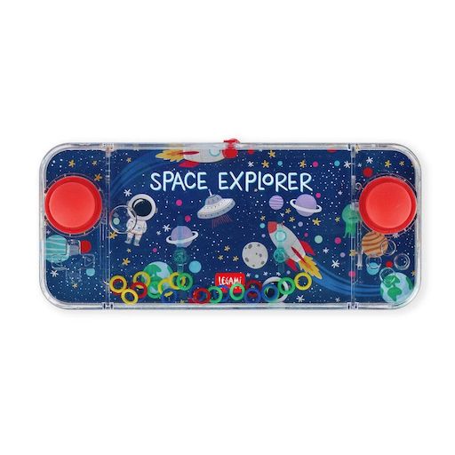 On dirait une console, mais il n'y a pas batterie , il fonctionne à l'eau, mais on peut le mettre dans sa poche. Avez-vous deviné de quoi il s'agit ? Du Mini jeu à eau sur le thème Space de Legami ! Appuyez sur les boutons pour mettre en mouvement les anneaux et les enfiler sur les cibles. Vous n'av