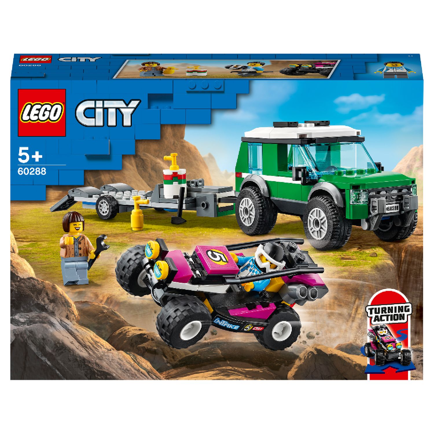 Le transport du buggy de course LEGO® City (60288), livré avec un 4x4 tout-terrain et une remorque pour transporter le buggy de course Baja dirigeable, est fabuleux. Les 2 figurines de pilote incluses garantissent des courses palpitantes !