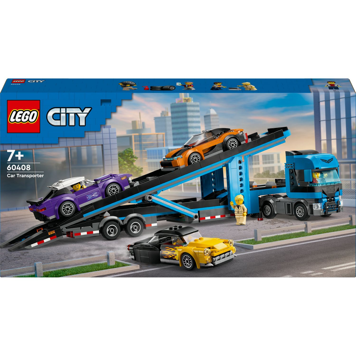 City 60408 - Le Camion de Transport de Voitures de Sport - Set de 4 Véhicules Pour Enfants dès 7 Ans - Cadeau de Fête ou d'Anniversaire pour Garçons et Filles - 4 Minifigurines pour le Jeu de Rôle