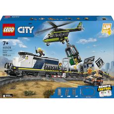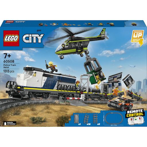 Sautez dans le train de l'aventure avec le jeu de construction Le braquage du train de police LEGO City (60508), dès 7 ans. Ce train électrique Powered Up pour enfants inclut une locomotive fonctionnelle et 3 wagons plateforme transportant une cellule, un coffre-fort et une voiture de rallye. Le set inclut également un circuit complet avec passage à niveau et un élément pour remettre le train sur les rails. Un hélicoptère avec grappin fonctionnel et des minifigurines de détective, de policier, de conducteur de train et de 3 escrocs donnent vie à un jeu de rôle palpitant.