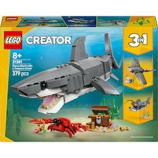 . FIGURINES 3-EN-1 D'ANIMAUX MARINS ? Avec le jeu de construction Le redoutable requin et le coffre au trésor LEGO® Creator 3-en-1 (31381), les garçons et les filles dès 8 ans peuvent construire et transformer 3 animaux marins avec les mêmes briques. UNE INFINITÉ D'OPTIONS DE JEU ? Les enfants peuvent imaginer des histoires amusantes avec 3 créatures marines : un requin qui garde un coffre au trésor, une baudroie ou une raie manta (les modèles ne peuvent pas être construits simultanément). FIGURINES D'ANIMAUX MARINS ARTICULÉES ? Le requin a une bouche, un corps, des nageoires latérales et une queue mobiles, la baudroie peut ouvrir la bouche et bouger les ailerons latéraux et la queue, et la raie manta possède une queue mobile. SUPPORTS ACCESSOIRISÉS POUR JOUER ET EXPOSER ? Le requin peut être posé sur un support avec un coffre au trésor et un crabe, la baudroie sur un support orné de plantes aquatiques et la raie manta sur un support avec une palourde. IDÉE DE CADEAU POUR ENFANTS ? Ce set LEGO® Creator 3-en-1 est un beau cadeau à offrir aux garçons et aux filles passionnés par l'océan, ou un petit cadeau d'anniversaire pour les constructeurs de 8 ans et plus qui aiment les jouets créatifs. PLUS DE JEUX 3-EN-1 ? Mettez en scène encore plus d'aventures de construction avec les autres sets de la vaste gamme LEGO® Creator 3-en-1 (vendus séparément). ALIMENTEZ LA PASSION DES ENFANTS ? Chaque set 3-en-1 offre aux enfants 3 options de construction inspirées de leurs plus grandes passions, notamment les animaux, les véhicules et les maisons. DIMENSIONS ? Le requin de ce set LEGO® de 379 pièces sur le thème des animaux marins mesure plus de 8 cm de haut, 26 cm de long et 11 cm de large