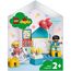 La salle de jeux LEGO® DUPLO® déborde de possibilités de jeu imaginatives. En compagnie d'un garçon et d'une fille, les enfants s'amusent à jouer à l’école dans la zone d'apprentissage et à fêter un anniversaire avec de la crème glacée, un cadeau et des ballons.