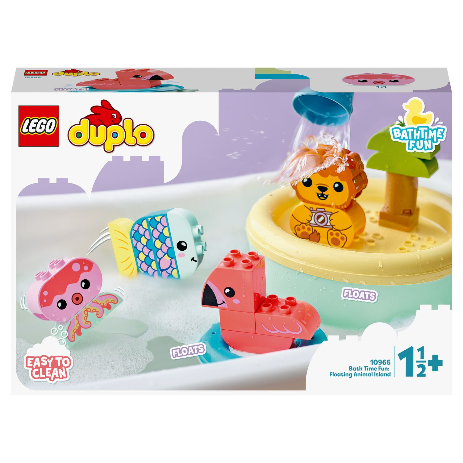 - Ce jouet pour baignoire avec animaux LEGO DUPLO inclut 4 figurines d’animaux DUPLO : un poisson, une pieuvre, un lion et un flamant rose