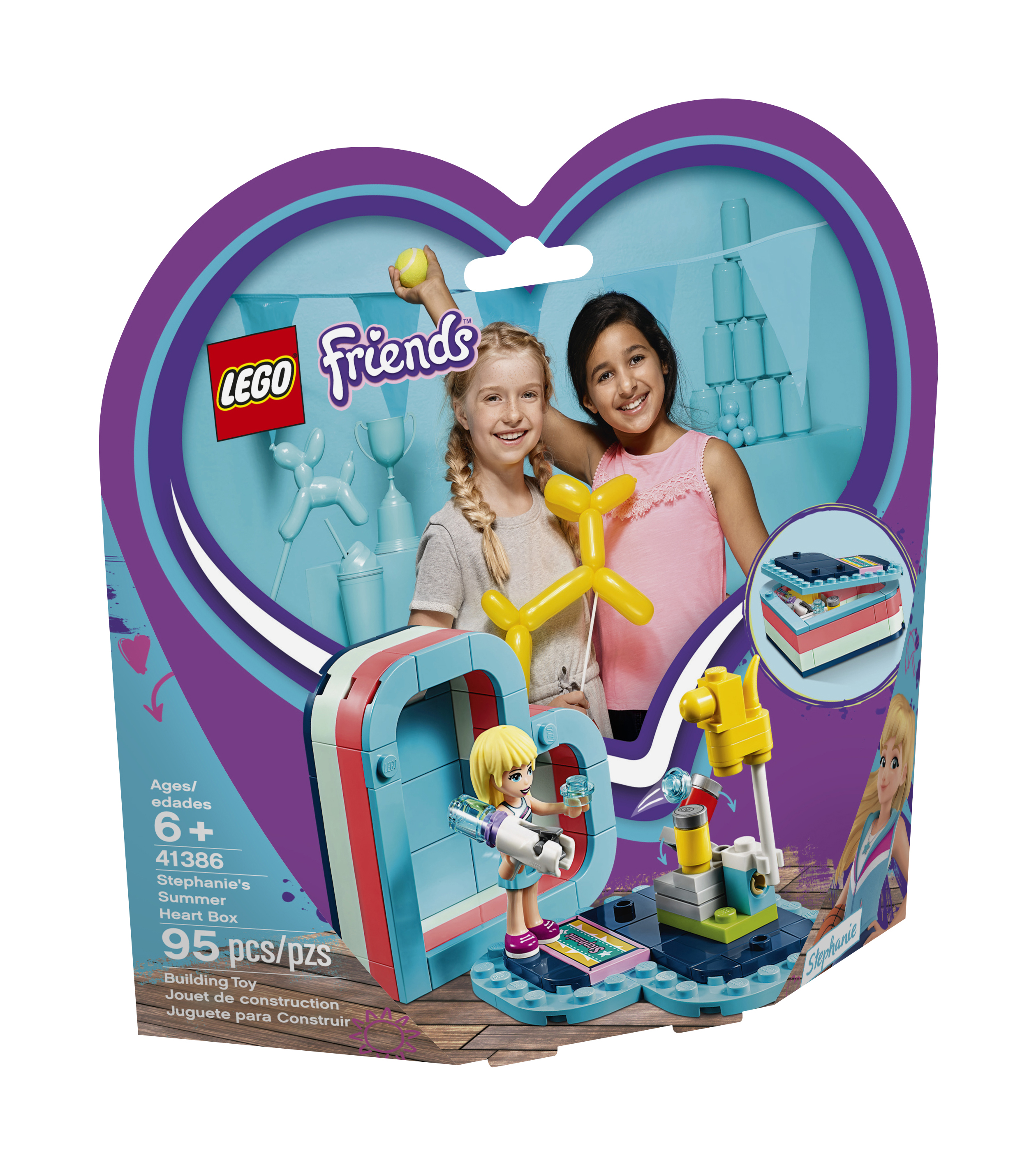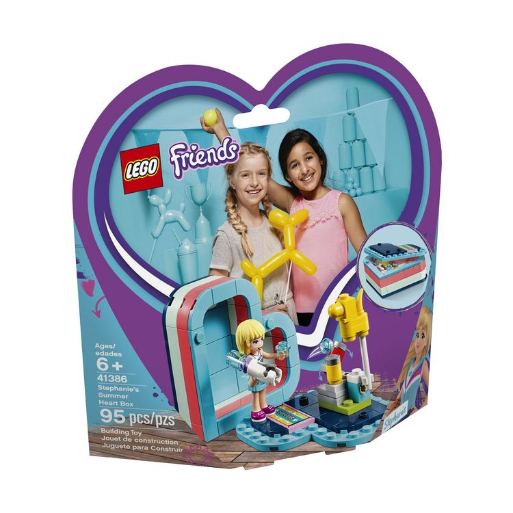 La boîte cœur LEGO® Friends comprend une mini-poupée Stéphanie, une zone à construire aux couleurs de Stéphanie avec une plaque nominative décorée, plus un stand avec des boîtes de conserve qui tombent et un pistolet à eau avec fonction de tir.
