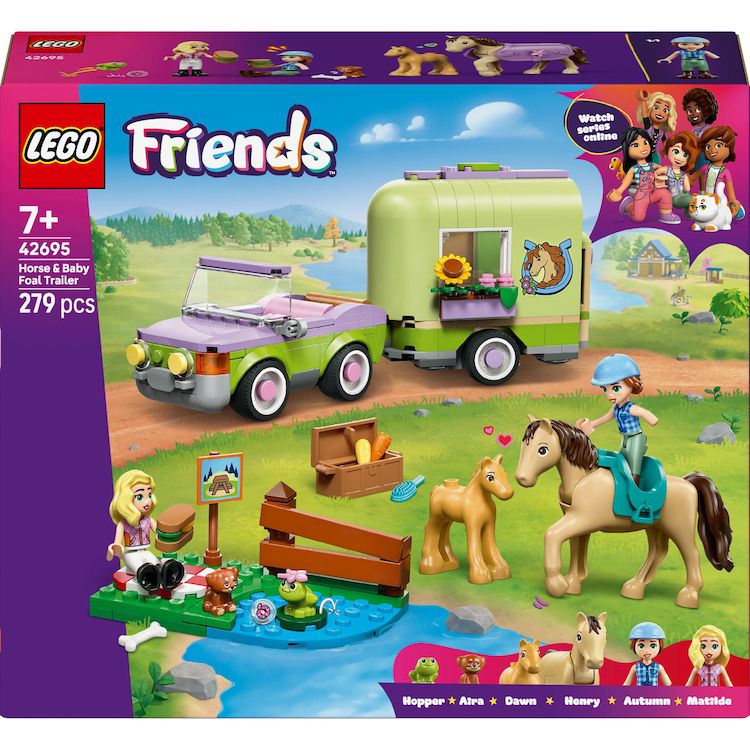 . SET DE CHEVAL AVEC REMORQUE ? Les filles et les garçons dès 7 ans se lancent au galop dans des jeux imaginatifs avec ce set d'animaux pour enfants incluant 2 mini-poupées, une voiture avec remorque, un cheval, un poulain, un chiot et une grenouille. PRENDRE SOIN DU CHEVAL ET DU POULAIN ? Les petits amis des chevaux peuvent explorer tous les aspects des soins aux animaux en pansant les chevaux, en les transportant dans la remorque et en leur faisant sauter des obstacles. 2 PERSONNAGES LEGO® FRIENDS ? Favorisant le jeu de rôle, le set détaillé La remorque du cheval et du poulain LEGO® Friends (42695) inclut les mini-poupées d'Autumn et Mathilde et inspire aux enfants des histoires sur leur passion pour les chevaux. DE NOMBREUX ACCESSOIRES ? Les accessoires de ce set LEGO® Friends incluent un obstacle à sauter, une selle, des sandwichs, un cageot, une brosse, des carottes pour les chevaux et 2 petites fleurs pour décorer la couverture du cheval. UN BEAU CADEAU POUR LES PASSIONNÉS DE CHEVAUX ? Ce jeu de construction pour enfants constitue un cadeau d'anniversaire amusant pour les filles et les garçons de 7 ans et plus qui aiment les chevaux et imaginer des histoires avec des animaux LEGO®. UNE FAÇON AMUSANTE DE CONSTRUIRE ? L'application LEGO® Builder guide les enfants dans la construction intuitive. Ils peuvent sauvegarder leurs sets, suivre leur progression, zoomer et faire pivoter les modèles en 3D. SÉRIE EN LIGNE ? Découvrez encore plus d'idées de jeux créatifs avec d'autres sets (vendus séparément) et la série en ligne LEGO® Friends : Un Nouveau Chapitre, où les enfants font connaissance avec les personnages de Heartlake City. DIMENSIONS ? La voiture de ce set de 279 pièces, avec sa remorque, mesure plus de 10 cm de haut, 21 cm de long et 7 cm de large