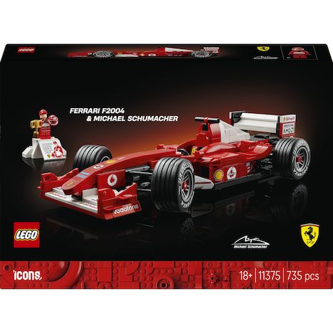 Célébrez l’âge d’or de la Formule 1 avec le set pour adulte Ferrari F2004 et Michael Schumacher LEGO Icons (11375). Construisez un modèle réduit de la voiture légendaire qui, avec Michael Schumacher au volant, a dominé la saison 2004. Cette réplique de Ferrari avec direction fonctionnelle, pneus rainurés et moteur V10 détaillé, inclut un présentoir affichant les détails et les statistiques du véhicule. La minifigurine de Michael Schumacher est accompagée d’un casque, d’un trophée et d’un présentoir-podium avec une image et une citation du septuple champion du monde.