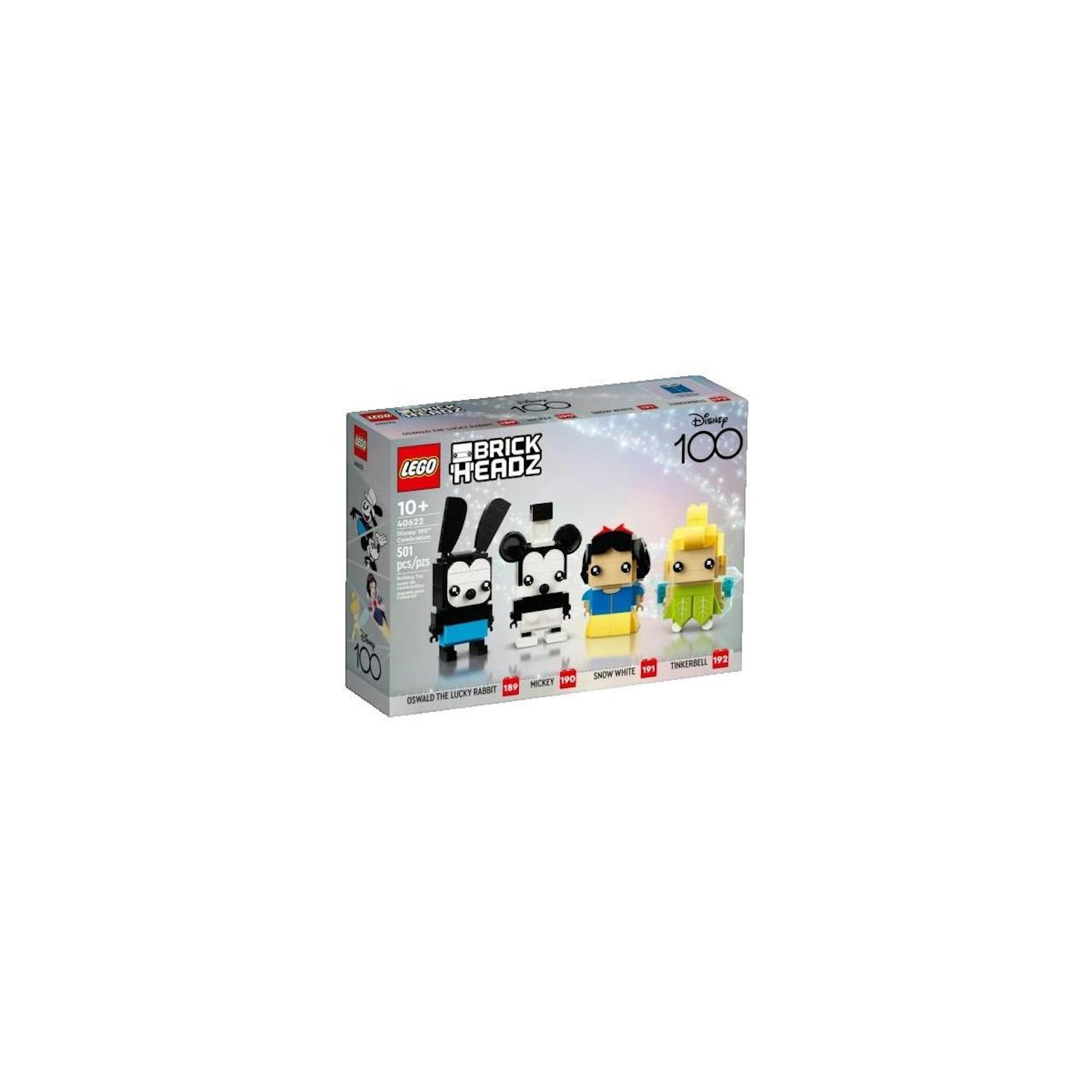 Le set LEGO BrickHeadz Disney 100e Célébration (40622) est un ensemble de construction comprenant 501 pièces en plastique ABS, destiné aux enfants dès 10 ans. Ce coffret célèbre le centenaire de Disney avec des personnages emblématiques tels qu'Oswald le lapin chanceux, Mickey Mouse, Blanche-Neige e