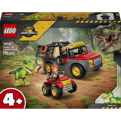 Des aventures passionnantes attendent les jeunes fans dès 4 ans avec le set Camion de transport du jeune T-rex LEGO® Jurassic World (77978). Les enfants peuvent construire 2 véhicules, puis se lancer dans un jeu créatif en cherchant comment sauver le T-rex. Aidez les 2 minifigurines LEGO à faire entrer le jeune T-rex dans la cage, à l’aide du quad, de la cuisse de poulet et du hot-dog piqué sur un bâton. Une fois le dinosaure dans sa cage, ils peuvent le charger dans le camion et se mettre en sécurité.