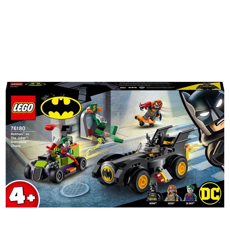 - Le set comprend 136 pièces. Batman 76180 Batman contre le Joker : course-poursuite en Batmobile inclut les figurines de Batman, Batgirl et le Joker, une Batmobile à construire, un hot rod déjanté, un coffre-fort et de nombreux accessoires authentiques.