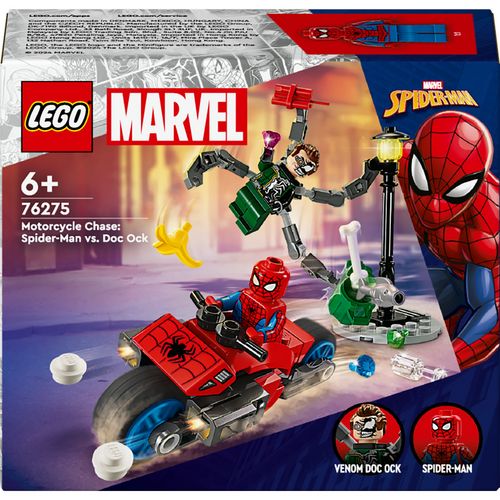 Cet ensemble surpuissant met en scène un méchant Venomisé et Spider-Man à moto. LEGO Marvel La Course-poursuite en Moto : Spider-Man contre Docteur Octopus (76275) est un jouet Spider-Man à construire doté de super extras pour les fans de super-héros âgés de 6 ans et plus.