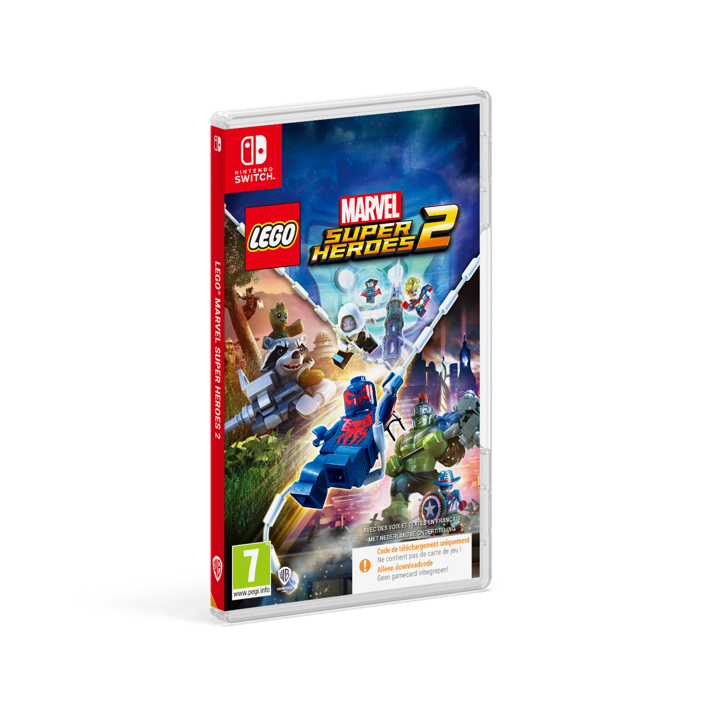 Le produit Code in a Box LEGO® Marvel Super Heroes 2 pour Nintendo Switch contient un code de téléchargement du jeu, permettant aux joueurs d'accéder à l'aventure complète sans avoir besoin d'un disque physique. C'est une solution pratique pour ceux qui préfèrent stocker leurs jeux numériquement.