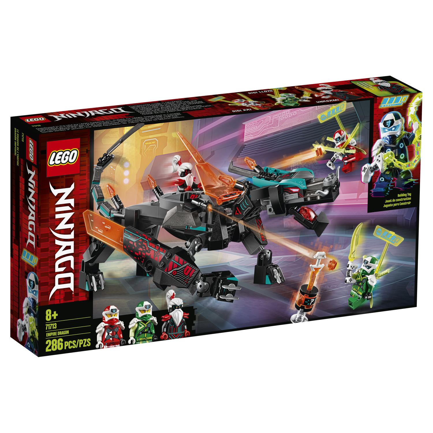 Les fans de LEGO® NINJAGO® vont adorer construire ce modèle de dragon et recréer des scènes d’action passionnantes de la série télévisée NINJAGO. Le robot dragon est une créature redoutable avec sa tête et ses membres articulés, ses ailes en lames numériques et ses deux fusils à tenons. Ce set NINJAGO® 71713 inclut 3 figurines : Digi Kai, Digi Lloyd et le souverain maléfique de Prime Empire, Unagami, qui peut faire appel à son dragon pour exprimer sa colère.