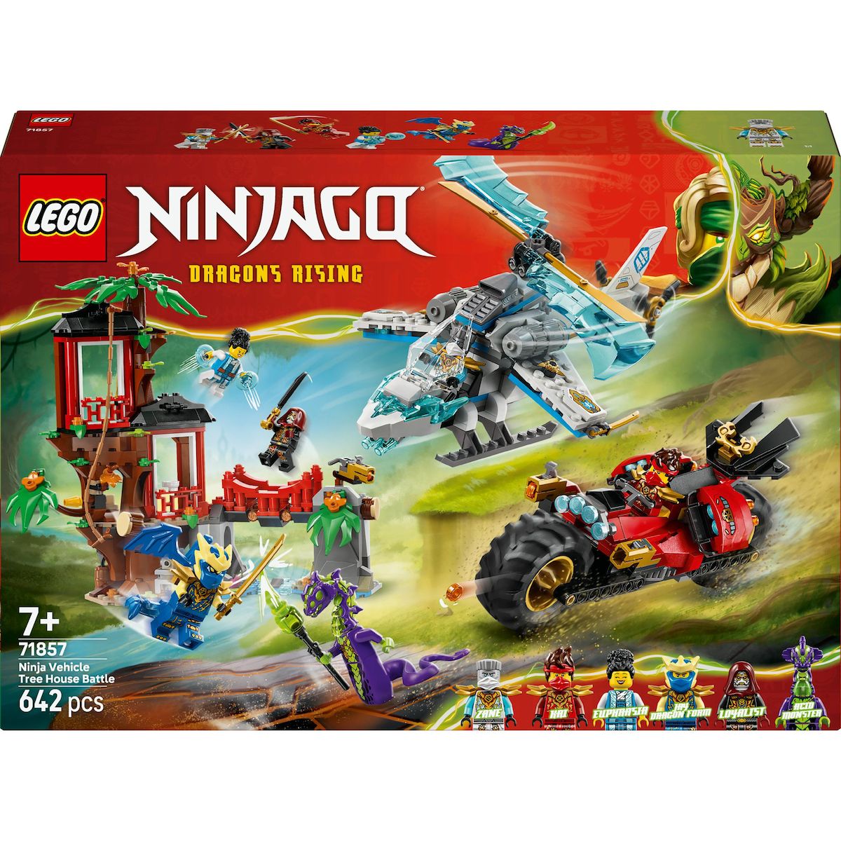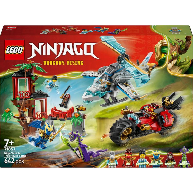 . JOUET DE COMBAT POUR ENFANTS ? Le jouet de construction La cabane et les véhicules des Ninjas (71857) invite les garçons et les filles dès 7 ans à recréer les scènes de combat de la saison 4 de la série TV NINJAGO® Le soulèvement des dragons. CABANE DE NINJAS DANS L'ARBRE ? La cabane à 3 niveaux inclut un atelier, un salon de thé, une terrasse, un piège qui libère un rocher, un pont pivotant, un fusil à tenons et une liane qui se balance. 2 VÉHICULES NINJAS ? La moto ninja a des roues mobiles, une selle sur laquelle une minifigurine peut prendre place et 2 fusils à tenons. L'hélicoptère possède un cockpit qui s'ouvre et des hélices qui tournent. 6 MINIFIGURINES NINJAGO® ? Ce jouet LEGO® NINJAGO inclut les ninjas Kai, Zane, Dragon Jay et Euphrasia, et inspire des combats entre le bien et le mal face à un monstre acide et un loyaliste. IDÉE DE CADEAU POUR LES ENFANTS ? Ce set NINJAGO® inclut une cabane à 3 niveaux dans un arbre, un hélicoptère et une moto, et constitue un cadeau ninja pour les enfants passionnés de jouets d'imagination et de culture fantastique. UNE FAÇON AMUSANTE DE CONSTRUIRE ? L'application LEGO® Builder guide les enfants dans la construction intuitive. Ils peuvent sauvegarder leurs sets, suivre leur progression, zoomer et faire pivoter les modèles en 3D. TOUT UN UNIVERS DE SETS LEGO® NINJAGO® ? Cette vaste collection de jouets permet aux enfants et aux fans de ninjas de s'évader dans un monde fantastique immersif, pour laisser libre cours à leur imagination et s'amuser avec leurs héros ninjas. DIMENSIONS ? La cabane dans l'arbre de ce set NINJAGO® de 642 pièces mesure plus de 22 cm de haut, 26 cm de large et 15 cm de profondeur