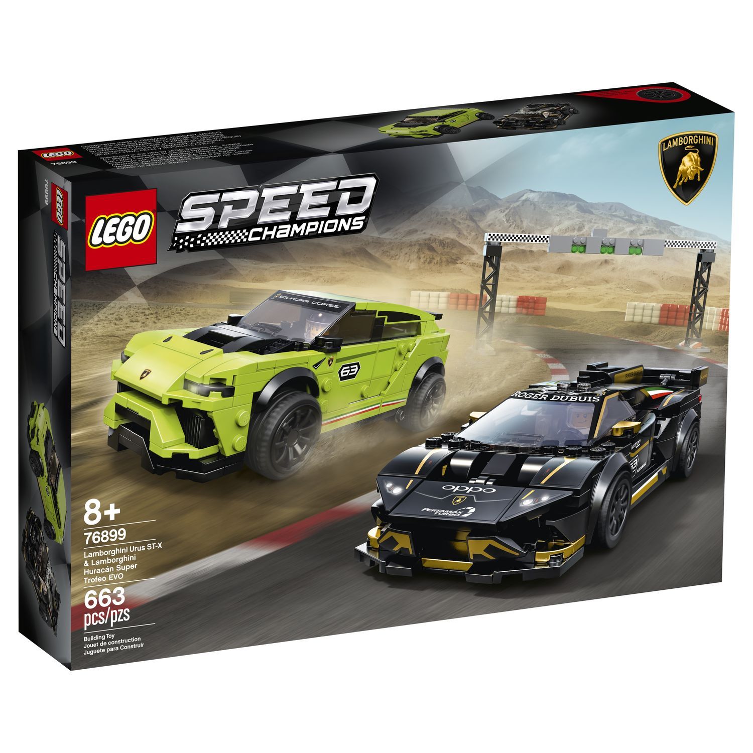 - Les répliques LEGO® des Lamborghini Huracán Super Trofeo EVO et Lamborghini Urus ST-X s'accompagnent d'une ligne de départ avec des « feux » et de 2 figurines de pilotes de course.