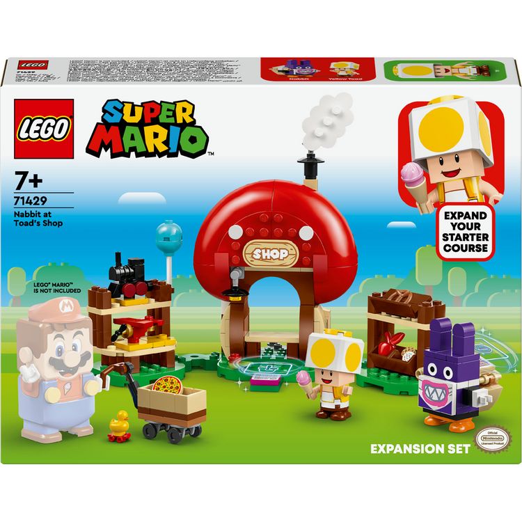 Cet ensemble LEGO Super Mario comprend 2 personnages Super Mario en briques - un Toad jaune et une figurine Carottin - ainsi qu'un magasin à construire avec des accessoires de nourriture assortis et un chariot de supermarché pour inspirer un jeu créatif avec le jouet de rôle. Pour un jeu interactif, ajoutez une figurine LEGO Mario, LEGO Luigi ou LEGO Peach d'un Pack de Démarrage LEGO Super Mario (71360, 71387 ou 71403 - chacun vendu séparément). Avec une figurine LEGO Super Mario interactive, le joueur peut sauter sur une brique d'action pour saluer Toad jaune, obtenir des aliments numériques comme de la glace, des fruits et des biscuits à la boutique, et piétiner le sac de Carottin pour obtenir divers objets numériques. Tu trouveras les instructions de construction pour cet ensemble sur l'application LEGO Super Mario. L'application propose également des idées de construction et de jeu imaginatives, et les enfants peuvent y partager leurs créations en toute sécurité.
