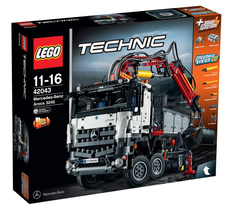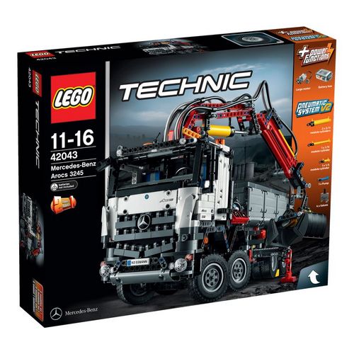 Construis et découvre le puissant Mercedes-Benz Arocs 3245 ! Monte à bord de la splendide Mercedes-Benz Arocs 3245 ! Ce modèle LEGO® Technic, énorme et solide, est plein de fonctions et de détails authentiques. Allume le grand moteur Power Functions inclus et mets en marche le système pneumatique perfectionné (nouveau à l'automne 2015) pour avoir un contrôle complet sur de nombreuses fonctions motorisées passionnantes. Tu peux faire fonctionner le mécanisme du bras de grue ultra flexible, ouvrir et fermer la pince, étendre les stabilisateurs ou soulever et abaisser la benne ! Une direction à double essieux, un système d'entraînement et une suspension totalement indépendante permettent de nombreuses manoeuvres, et la cabine du chauffeur bascule pour révéler un moteur 6 cylindres détaillé avec des pistons mobiles. Ouvre les portes de la cabine pour accéder à l'intérieur détaillé avec un tableau de bord, un siège bleu et un volant de direction avec un logo Mercedes-Benz.