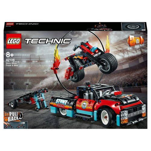Cette boîte LEGO® Technic 42106 réunit action et vitesse pour le plus grand plaisir des fans de cascades ! Elle comprend une moto, un camion, une remorque et un anneau de feu à construire, pour s'amuser à réaliser des cascades. La remorque est amovible et se transforme en rampe afin d'envoyer la mot