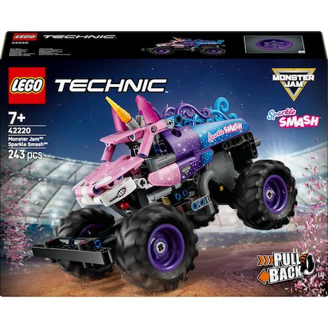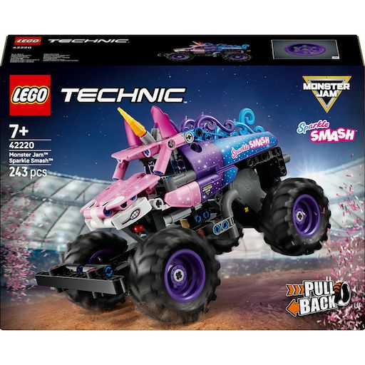 . MONSTER JAM? À CONSTRUIRE ? Le Monster Jam Sparkle Smash? LEGO® Technic à rétrofriction (42220) offre des heures de jeu aux enfants, garçons et filles, à partir de 7 ans qui aiment les monster trucks et les licornes. MONSTER TRUCK À RÉTROFRICTION ? Tirez le camion vers l'arrière, puis relâchez-le pour recréer les sensations fortes de l'arène Monster Jam? avec des figures et des cascades fascinantes. DÉTAILS DE LICORNE ? Ce set de construction Monster Jam? inclut des détails authentiques inspirés du véritable camion Monster Jam Sparkle Smash?, tels que des étoiles scintillantes et une corne de licorne. STIMULE LE JEU CRÉATIF ? Les enfants peuvent créer leurs propres événements et aventures Monster Jam? épiques avec ce modèle réduit de camion. IDÉE DE CADEAU POUR ENFANTS ? Ce set de construction LEGO® Technic constitue un cadeau amusant pour les garçons et les filles à partir de 7 ans, passionnés par les monster trucks et les voitures à rétrofriction. ENCORE PLUS DE SETS À DÉCOUVRIR ? Offrez encore plus d'action avec la gamme de sets LEGO® Technic (vendus séparément), intégrant des mouvements et des mécanismes réalistes qui inspirent les jeunes constructeurs. UNE FAÇON AMUSANTE DE CONSTRUIRE ? L'application LEGO® Builder guide les enfants dans la construction intuitive. Ils peuvent sauvegarder leurs sets, suivre leur progression, zoomer et faire pivoter les modèles en 3D. DIMENSIONS ? Le camion de ce set de 243 pièces mesure plus de 12 cm de haut, 19 cm de long et 11 cm de large