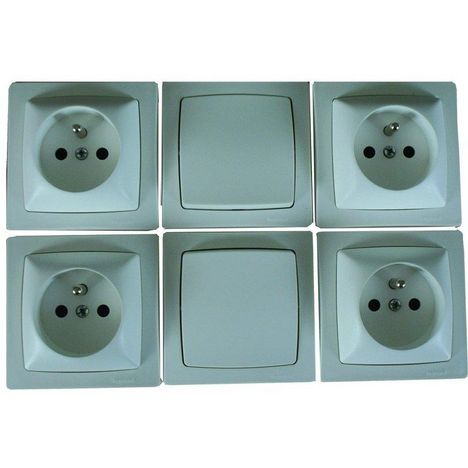 Lot de 2 interrupteurs + 4 prises de courant avec terre saillie.Interrupteur ou va-et-vient : 10 Ampères, puissance maxi 2 300 Watts en 230 Volts.Prise de courant avec terre saillie : 16 Ampères, puissance maxi 3 680 Watts en 230 Volts.Fixation murale en saillie par vis.