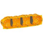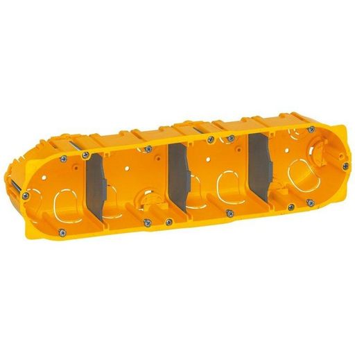 Boîte d'encastrement 4 postes Batibox plaque de plâtre profondeur 40 mm.S'encastrent dans plaques de plâtre Fixation par serrage d'étriers dans plaque de plâtre.Diamètre de perçage : 67 mm - Entraxe de perçage : 71 mm.Montage horizontal ou vertical.Equipées de cloisons amovibles pour la séparation d