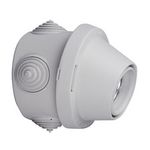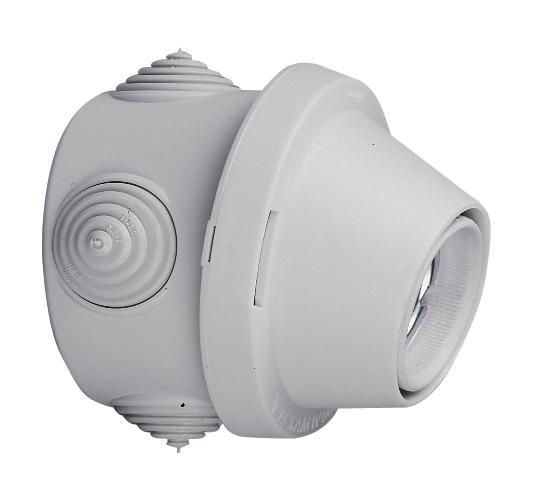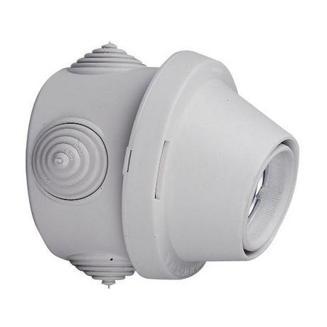 Boîte étanche support de douille pour Applique.Pour ampoules à vis E27.Puissance maxi de l'ampoule : 100 W en 230 V.Douille porcelaine livrée montée sur boîte étanche ronde Ø70 mm.4 entrées de fils par embouts d'étanchéité découpables.Fixation par vis.Position droite ou inclinée par simple rotation