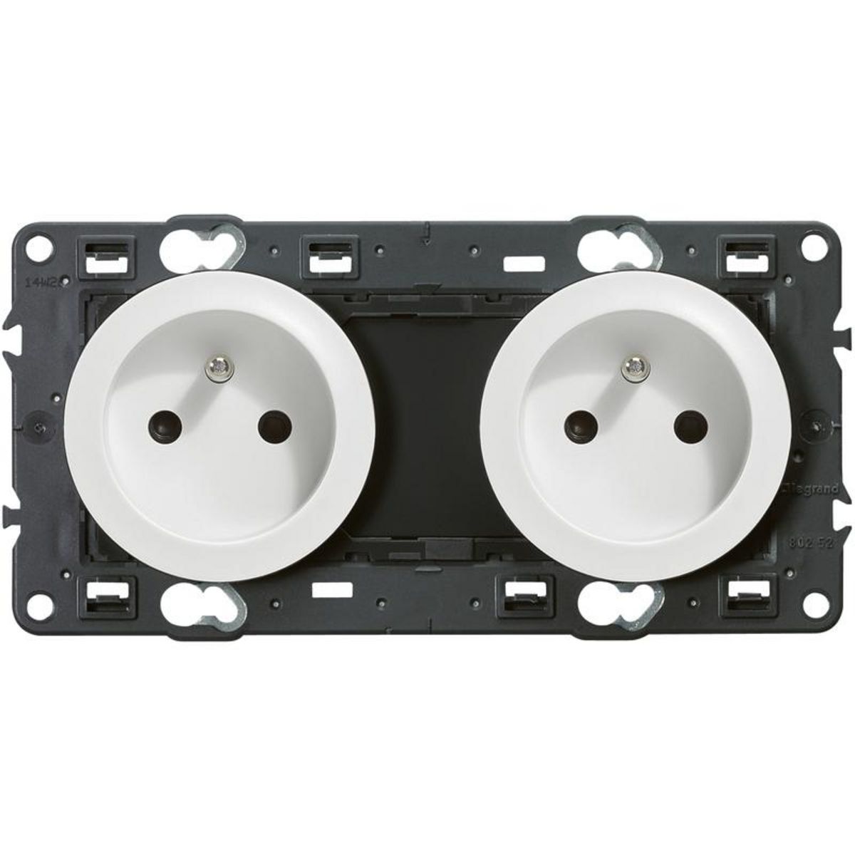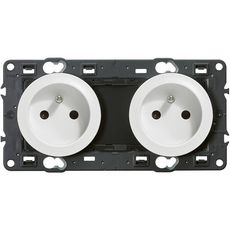 Double prise de courant affleurante avec terre 2 x 2 Pôles + Terre pré câblée Blanc à composer.Mécanisme double avec terre, pré câblée.Option affleurante.Prises testées pour résister à 10000 manoeuvres.16 Ampères, puissance maxi 3 680 Watts en 230 Volts.