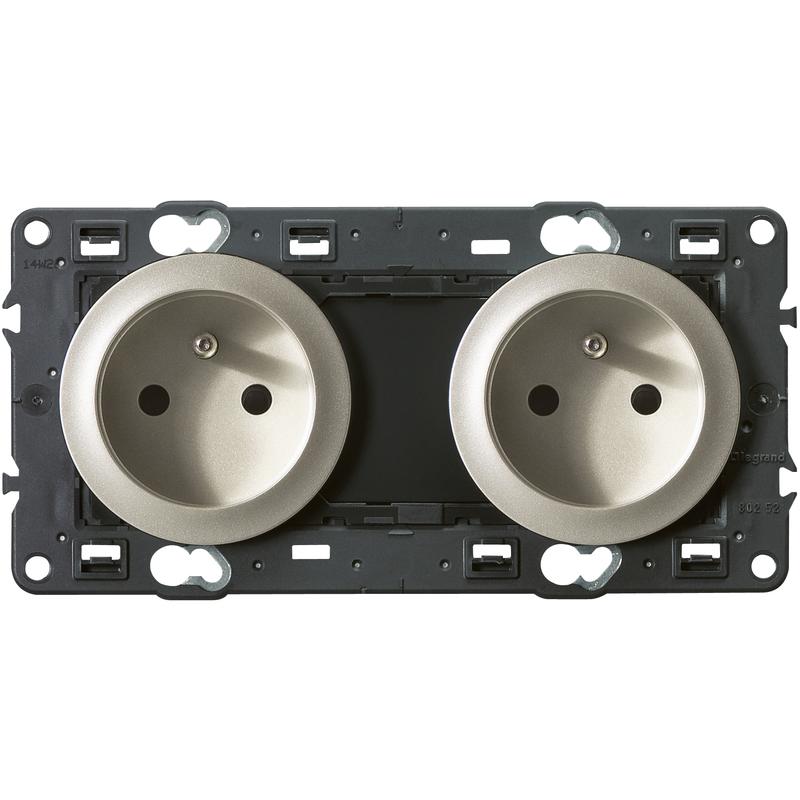 Prise 2x2 Pôles + Terre pré-câblée CELIANE Legrand coloris titane, à composer avec une plaque personnalisée, pour brancher 2 fiches électrique 2 Pôles + Terre sur un socle avec la même arrivée de courant.