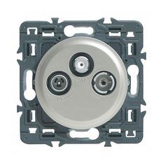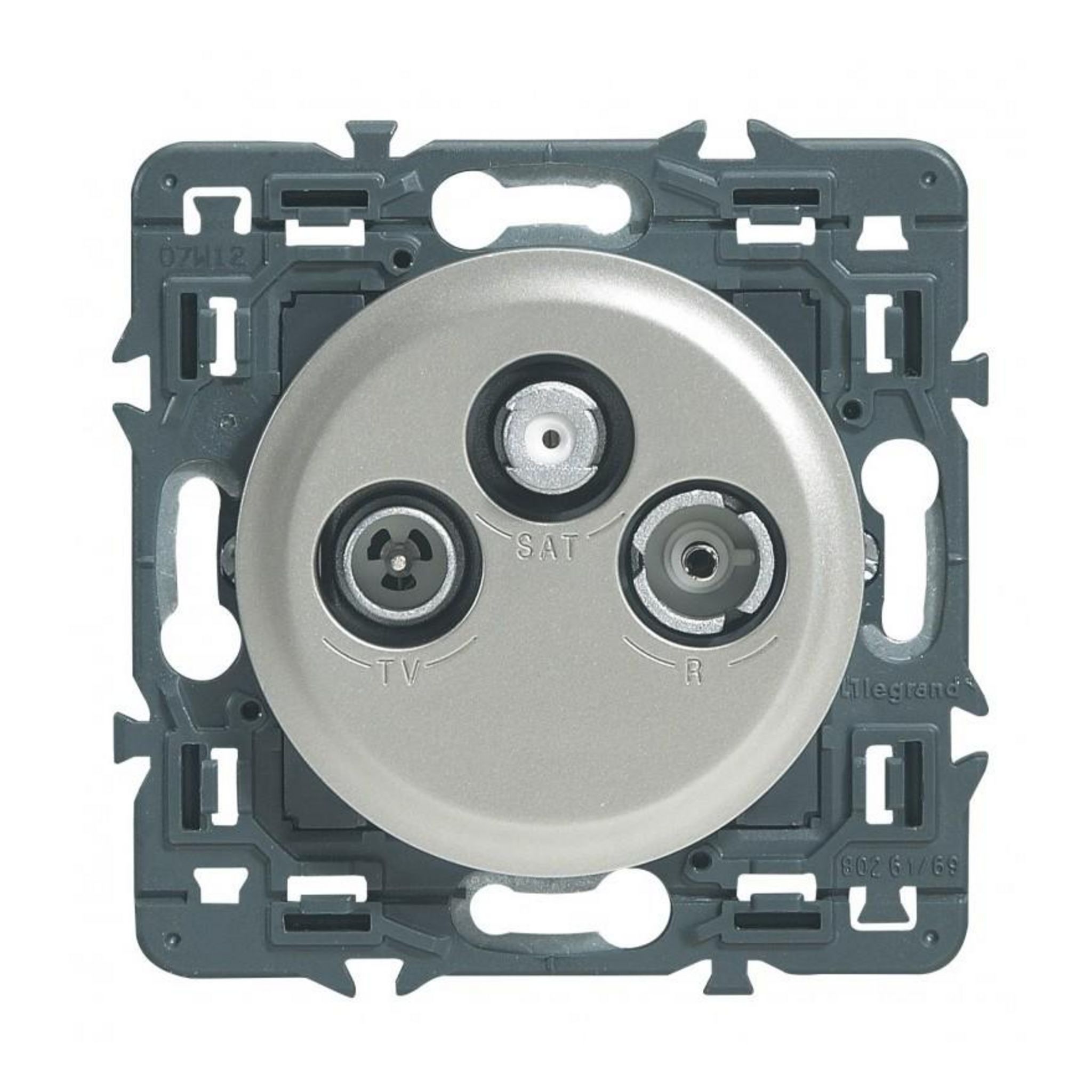 Prise TV-FM-SAT à composer. Coloris Titane. Dimensions 3,5 x 7 x 7 cm. Pour réception hertzienne et satellite avec démodulateur individuel (TPS, Canal Satellite...). Prise TV mâle Ø,9,5 mm, Prise FM femelle Ø,9,5 mm, Prise satellite type ''F'', à visser. Equipées d'une borne de connexion