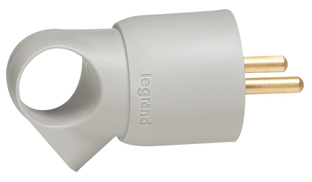 Fiche 2Prises+Terre avec anneau Legrand, en plastique, et de couleur grise, avec fixation à vis.Le système installé garantit le degré de protection IP 55.Conforme aux normes EN 60439-1 et 2.