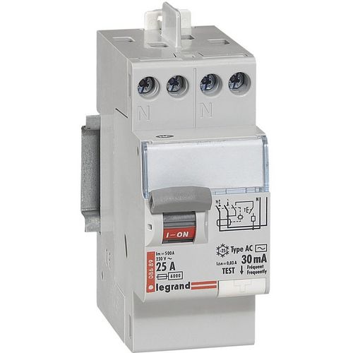 Interrupteur Différentiel BIPOLAIRE 25 Ampères 30 Ma Type AC.Type AC - pour peigne HX³ optimisé universel mono réf. LEG92794.Entrée Vis / Sortie Vis.Sensibilité : 30 Ma.ln : 25 Ampères.Nombre de modules : 2.