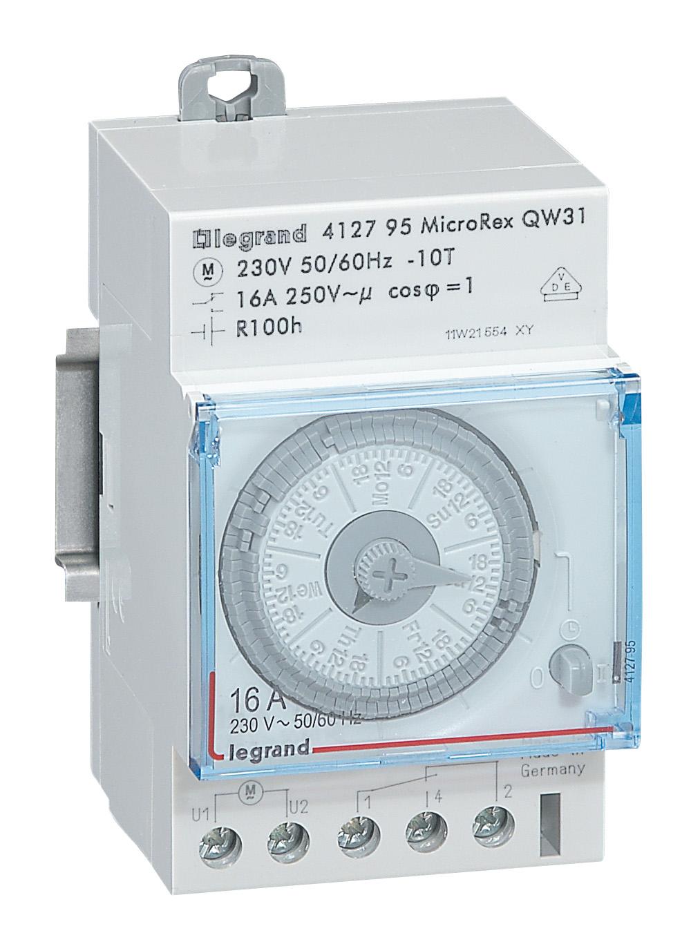 Inter-horaire programme analogique Cadran horizontal hebdomadaire avec Réserve marche.Précision de commutation de l',horloge : 30 minutes.Nombre de modules : 3.Programmation minimum : 4 heures.1 segment = 2 heures.Réserve de marche de l',horloge : 100 heures.Cadran horizontal.1 sortie 16 amp