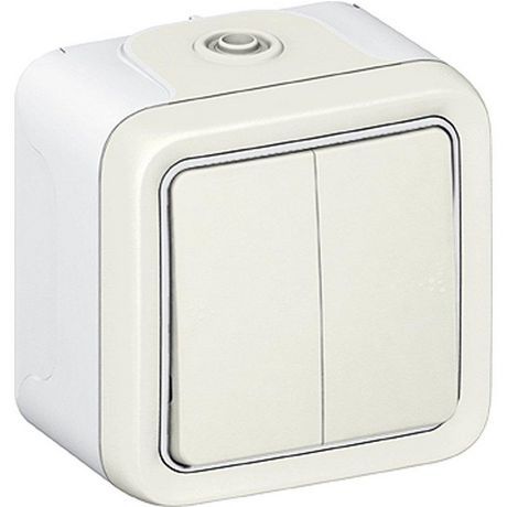 Double interrupteur ou va et vient apparent complet Plexo.Coloris Blanc.Dimensions 6 x 8 x 8 cm.Matière Plastique.Possibilité de créer un va-et-vient en associant 2 interrupteurs.10 Ampères, puissance maxi 2 300 Watts en 230 Volts.Appareillage Plexo livré complet sous film Etanchéité renforcée.Indic