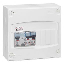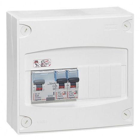 Tableau électrique équipé et câblé Drivia Legrand, 9 modules répartis sur 1 rangée (4 modules libres). IP 30. Pose en saillie. Tableau destiné à une extension de logement. Composé d&apos,un interrupteur différentiel 40A type AC et de 2 disjoncteurs (1x16A, 1x10A). Les disjoncteurs sont à connexion à vis et ont un pouvoir de coupure de 3kA. Bornier terre inclus. Rail de fixation métallique et porte étiquette. Possibilité d&apos,équiper d&apos,une porte. H 18 x l 19 x P 10 cm