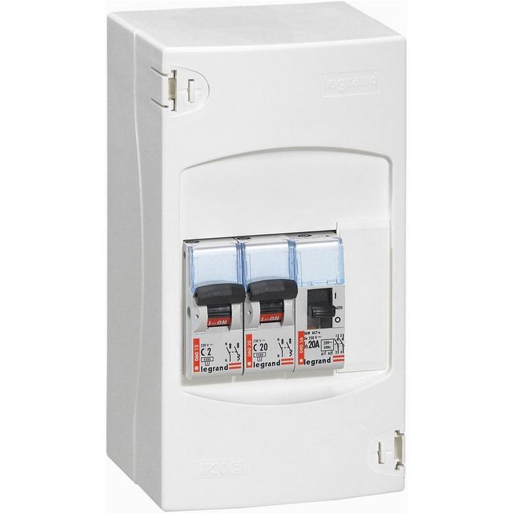 Tableau Chauffe Eau.Coloris Blanc.Dimensions 17 x 10,4 x 10 cm.Matière Plastique.Tableau 1 rangée de 4 modules.1 contacteur jour/nuit 230 Volts.1 dijoncteur 2 Ampères.1 dijoncteur 20 Ampères.Evolutifs grâce à 1module libres.