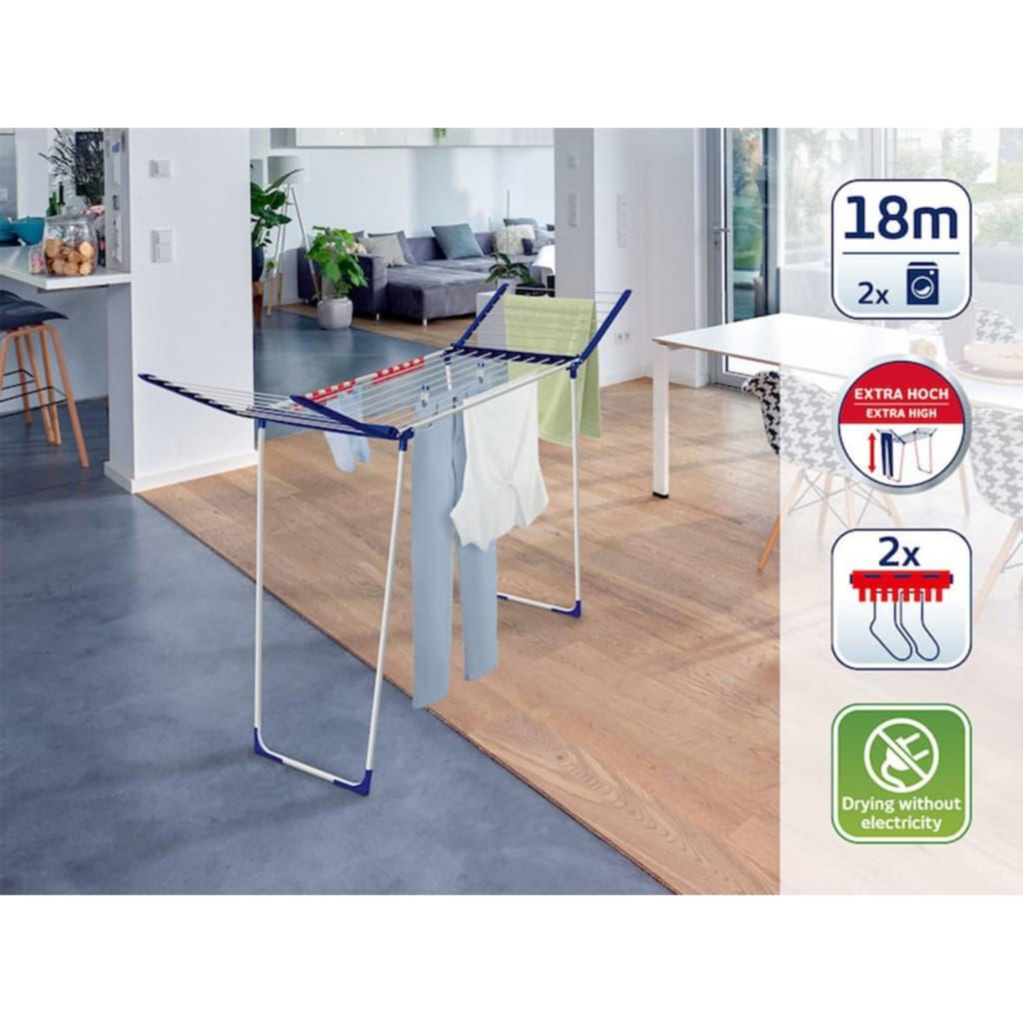 Avec ses deux ailes depliables et une longueur de sechage de 18 metres, le Pegasus Maxx 180 a de la place pour deux charges de linge en machine.