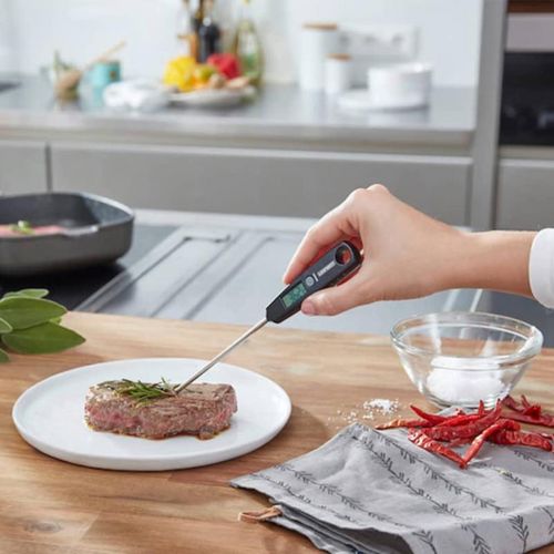Doté d'une sonde longue et fine en acier alimentaire, ce thermomètre noir et argenté s'adapte aux contenants étroits. Son revêtement plastique antidérapant assure une prise en main sécurisée, même en milieu humide, facilitant son nettoyage après utilisation.