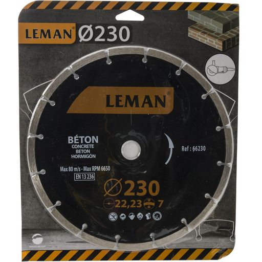 Informations Techniques: Disque diamant à segments pour maçonnerieBricolage, tous travaux de maçonnerie ponctuels, sauf béton arméDisque diamètre: 230 mmHauteur de segments: 7 mmAlésage: 22,23 mmÉpaisseur du segment: 2,5mmVitesse de rotation Max: 6650 trs/mn