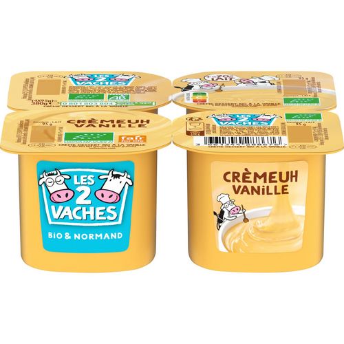 Le Crèmeuh vanille Les 2 Vaches est une crème dessert, gourmande et généreuse avec du lait bio et équitable de Normandie. La recette est simple avec une liste d'ingrédients bio et équitables. Notre crème dessert à la vanille de Madagascar, onctueuse et délicate, est parfaite pour terminer le repas sur une note gourmande ! Les 2 Vaches Crèmeuh vanille est fabriqué au Molay Littry (Calvados).