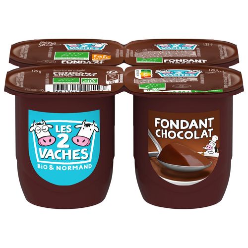 Le Fondant Cacao Les 2 Vaches est un dessert bio irrésistible dont la texture ferme et fondante fera fondre vos papilles dès la première cuillère. Ce dessert est élaboré avec des ingrédients bio et équitables, notamment du cacao en poudre pour des saveurs subtiles et intenses. Le lait bio normand et la crème de lait bio apportent une onctuosité et un doux goût incomparable. Cette crème dessert cacao est fabriquée au Molay-Littry (Calvados) avec du bon lait bio normand issu du commerce équitable.