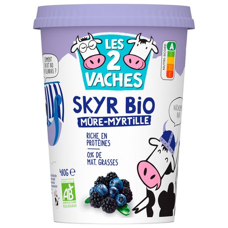 Les 2 Vaches Skyr mûre myrtille est riche en protéines et sans matières grasses. Ce skyr bio est produit dans notre usine de Ferrières-en-Bray (Seine-Maritime) avec du bon lait bio français, du sucre et des fruits bio, le tout dans un pot en carton ! Il a une texture consistante et onctueuse. Ce skyr bio au Nutriscore A est donc parfait comme encas ou pour le petit-déjeuner.