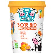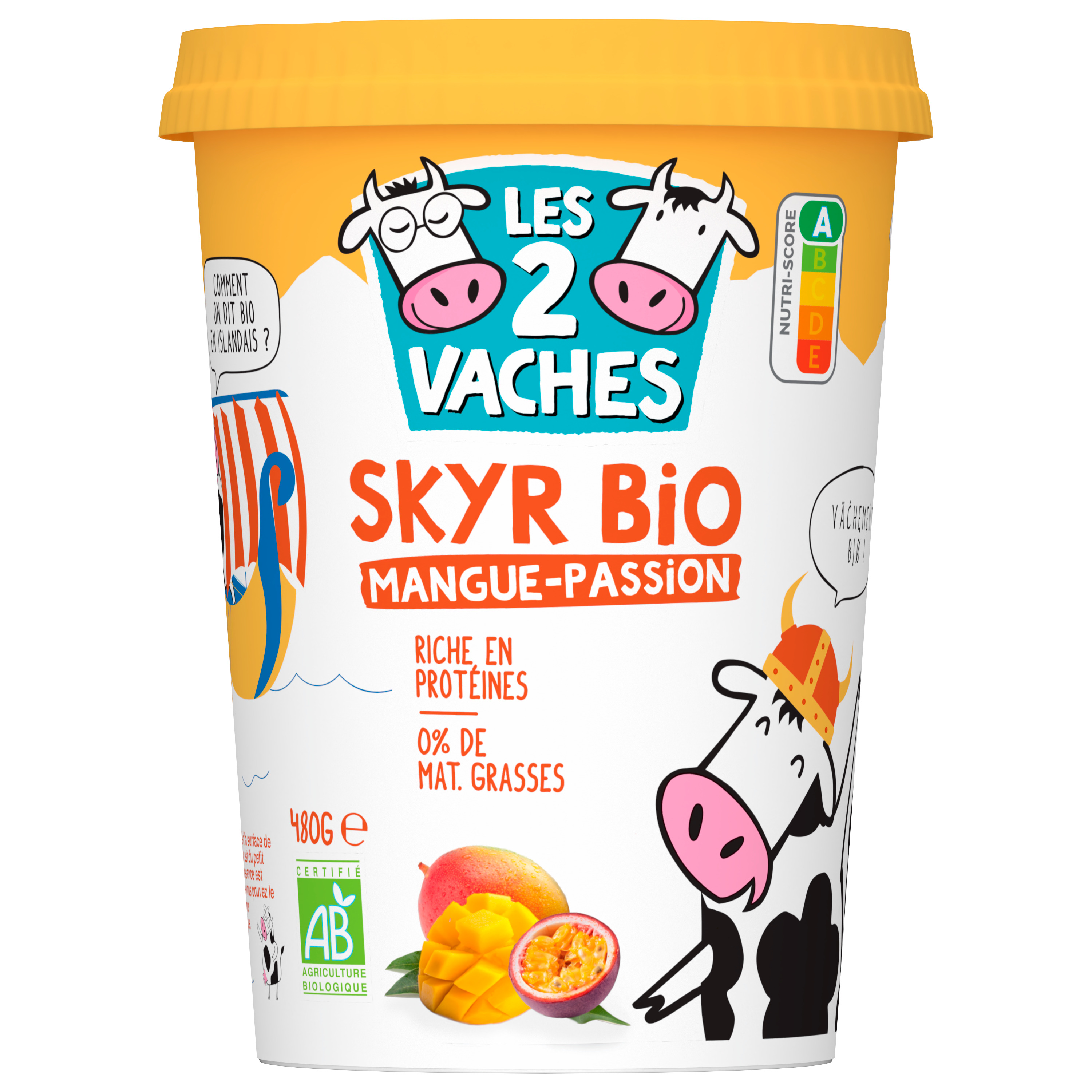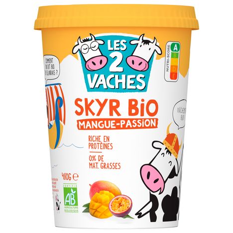 Les 2 Vaches Skyr mangue passion est riche en protéines et sans matières grasses. Ce skyr bio est produit dans notre usine de Ferrières-en-Bray (Seine-Maritime) avec du bon lait bio français, du sucre et des fruits bio. Il a une texture consistante et onctueuse. Ce skyr bio au Nutriscore A est donc parfait comme encas ou pour le petit-déjeuner.