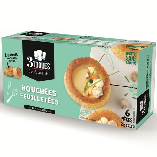 Avec les Prêts à garnir 3 TOQUES, le Chef c'est vous ! Réalisez facilement vos cocktails, plats et desserts. Les recettes pâtissières et gourmandes 3 TOQUES respectent l'environnement, le bien-être animal et la tradition. La Bouchée feuilletée 3 TOQUES : une bouchée légère et croustillante, facile et rapide à préparer ! Sa recette accessible, gourmande alliée à son feuilleté croustillant sont parfaits pour se faire plaisir au quotidien. Fabriquée avec de la farine de blé français, la Bouchée feuilletée 3 TOQUES suit la méthode traditionnelle française du feuilletage qui voit la matière grasse végétale être disposée entre les couches de pâte, garante d'un feuilleté léger et aéré. Déjà cuites, faciles et rapides à mettre en œuvre, les 6 Bouchées feuilletées 3 TOQUES sont à réchauffer 6-8 minutes au four à 170° avant d'être garnies. elles seront ainsi plus croustillantes. Pratiques, elles sont conditionnées en deux saches fraîcheur de 3 bouchées pour préserver leur texture. Parfaites avec une garniture à base de poulet et sauce crémeuse aux champignons, elles accueilleront et mettront en valeur toutes vos garnitures crémeuses à base de viande, de poisson ou de légumes. A vous de laisser parler votre créativité pour le plaisir de vos invités, famille et amis !