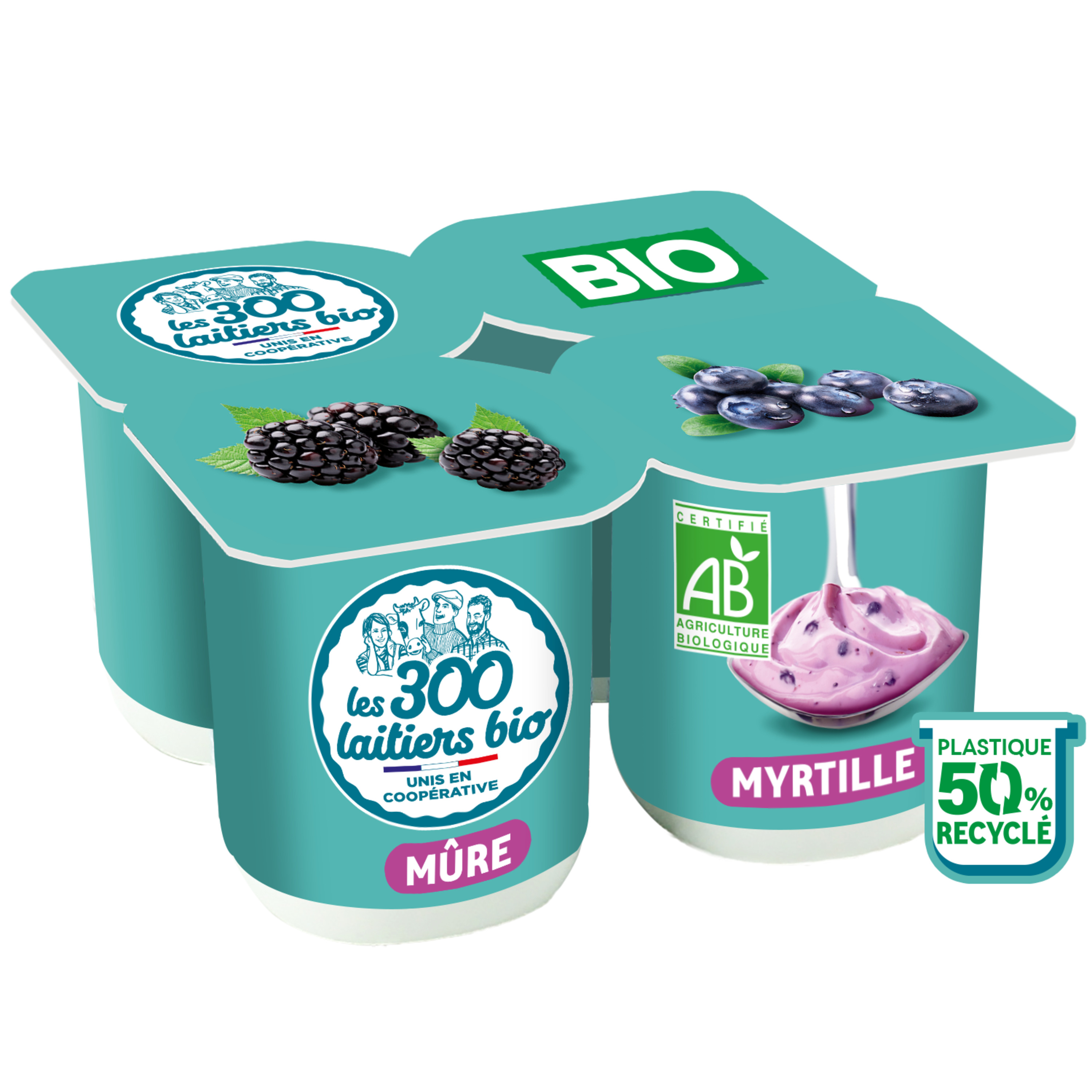 Les 300 laitiers bio vous propose les combinaisons de vos fruits préférés mure/myrtille et abricot/pêche et mangue/ananas et figue/pruneau pour des moments gourmands et de partage avec toute la famille.
