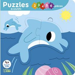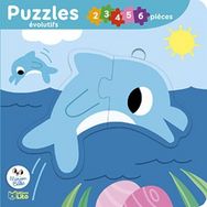 Un livre pour les tout-petits contenant 5 puzzles de 2, 3, 4, 5 et 6 pièces, sur le thème des animaux de la mer.