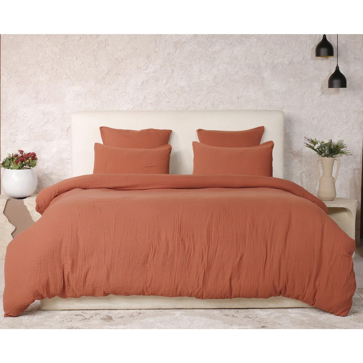 MATIERE : 100% Gaze de Coton lavé 145GSM. En 100 % double Gaze de Coton lavé, matière qui ne pourra que gagner en souplesse et en douceur au fil des lavages. Naturellement froissée et facile à vivre, finie la corvée de repassage pour un lit impeccable, il sera parfait au naturel pour une chambre Caractéristiques de la Parure de lit.