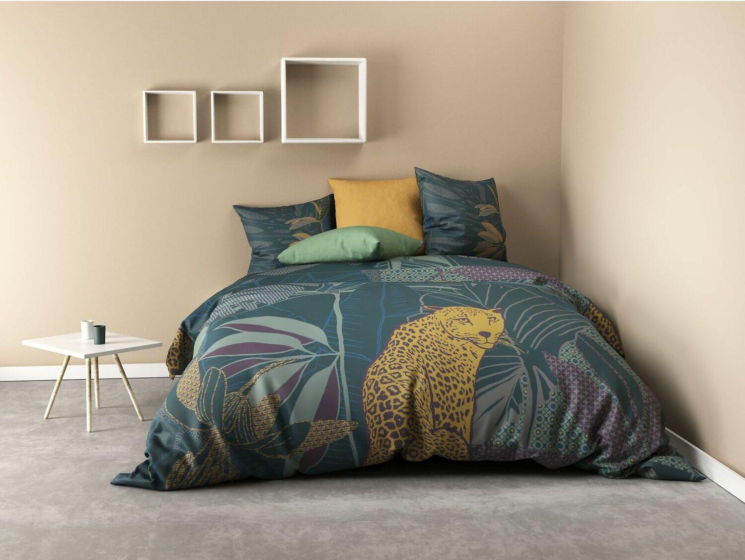 PARURE DE COUETTE 3 PIECES 260x240 100% COTON 47 fils/cm2 Parure de lit comprenant : 1 x housse de couette 260x240cm + 2 x taies d'oreiller 63x63cm MATIERE : En coton, un tissu souple et résistant de qualité supérieure grâce à son tissage ultra serré (47 fils/cm²) constitué de fils de coton . Caractéristiques de la housse de couette et de la taie d'oreiller : Pur coton (47 fils/cm²) Finition : housse de couette boutonnière dissimulée et taie portefeuille Housse de couette et taie d'oreiller lavable à 40°C Laver et repasser sur l'envers afin de protéger les couleurs Produit certifié Oeko-Tex® : Le label Oeko-Tex® garantit que les articles testés et certifiés ne présentent pas de substances nocives substances pouvant nuire à la santé. La parure de lit Wayapi vous est proposée par Les Ateliers du Linge. Vous qui rêvez d'aventure, endormez-vous dans une jungle incroyablement douce. Cette parure composée de 3 pièces, comprend 1 housse de couette et 2 taies d'oreiller 100% coton. Le tissage serré de ce coton premium vous assure une qualité durable au fil du temps et des utilisations. Lavez votre linge en machine jusqu'à 40°C sans craindre de l'abîmer puisqu'elle conservera fidèlement sa forme et ses qualités isolantes. Douce au toucher et respectueuse de votre peau, la matière est certifiée Oeko-Tex afin de convenir à toute la famille, enfants et personnes sensibles compris. La vie sauvage n'attend plus que vous ! Cette parure de couette existe également dans les dimensions 260x240 cm avec 1 housse de couette et 2 taies d'oreiller. à 40° - Javel non - Sechage Modéré 60° - Repassage moyen 150° - Nettoyage interdit