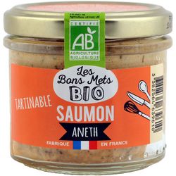 Ingrédients : "Chair de saumon* (50%) (poisson), crème fraîche* (lait), œuf*, flocon de pomme de terre* (pomme de terre*, extrait de romarin*), huile d'olive*, aneth* (1,5%), sel, poivre*.