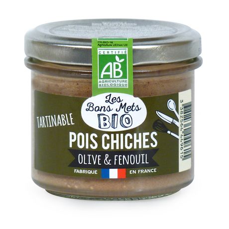 Ingrédients : Pois chiche* (25%), eau, crème de soja* (soja* lactofermenté (eau, soja* dépelliculé, ferments sélectionnés), huile de soja*, huile d'olive*, épaississant : farine de guar*), huile d'olive*, fenouil* (6,5%), olive noire (6,2%), pâte de sésame*, citron* co
