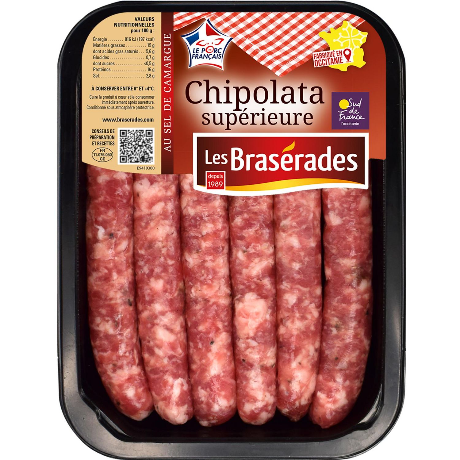 Élaborée à partir de viande de porc d'origine française et de boyau naturel, au sel de Camargue, Sud de France. Fabriquée en Occitanie.